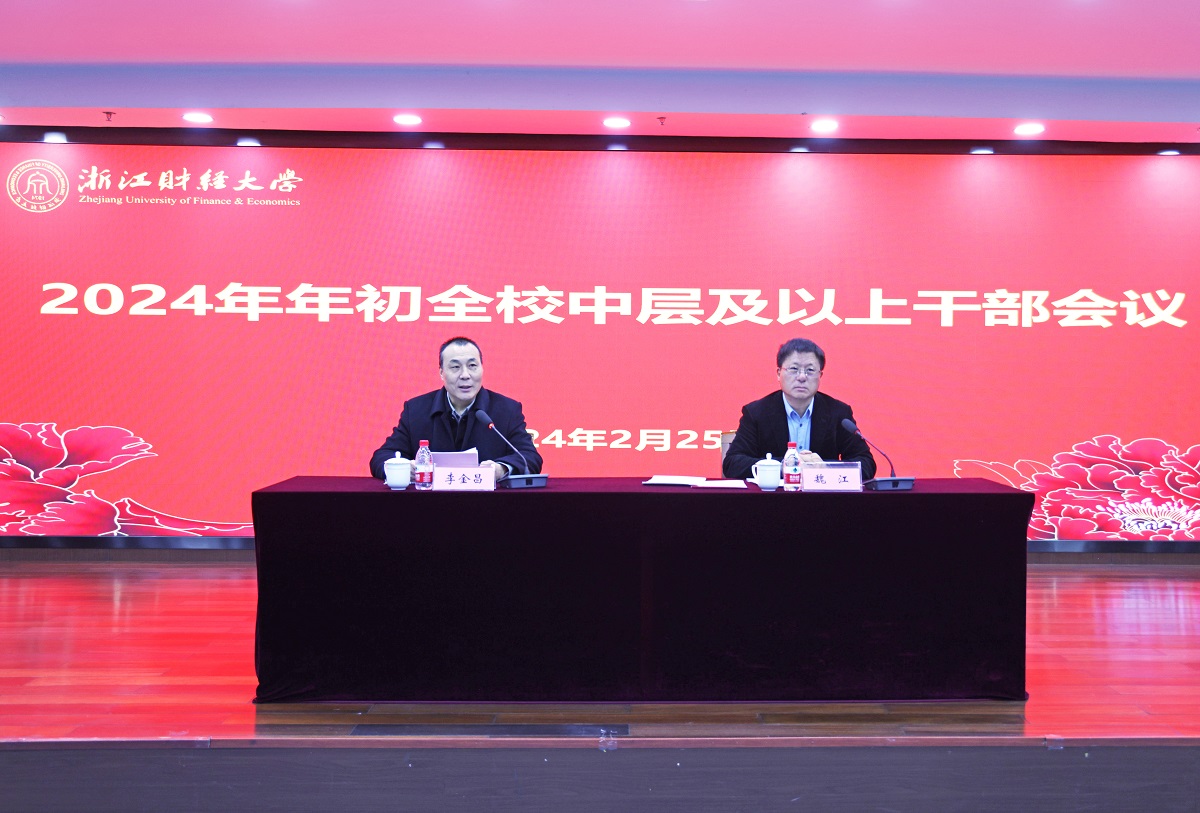 本网讯 春雨润物万物生,奋进征程正当时。2月25日,学校召开2024年年初中层及以上干部会议,部署2024年度重点工作。校党委书记李金昌主持会议并讲话,党委副书记、副校长(主持行政日常工作)魏江作工作部署。校领导班子全体成员、全体中层干部参加会议。李金昌指出,2024年是新中国成立75周年,也是学校建校50周年华诞、全面落实“新财经战略”的开局之年。要深入学习贯彻省委“新春第一会”要求,树牢“大人才观”,聚焦个体...