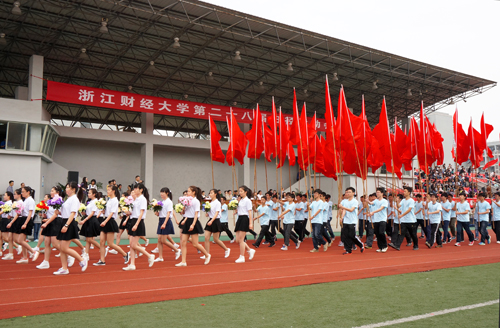 各学院方阵依次入场,与众不同的方阵表演展现了每个学院独特的精神风貌。入场仪式结束之后,副校长钟晓敏为运动会开幕式致辞。他向同学指出,体育运动是强身健体,塑造顽强品格的良好方式。我校历来重视体育运动的开展,我校运动队在上一届省大学生会上取得了团体总分第三的成绩;同时学校群众性体育活动,如阳光晨跑、校园健身走等,也在有序进行。他希望全体运动员发扬奥林匹克精神,取得优异成绩,并预祝运动会取得圆满成功。紧接着,运动员代表和裁判员代表在主席台庄严宣誓。随后,苏为华副校长宣布运动会正式开幕。