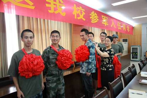 9月3日 学校为光荣参军入伍的7位同学戴上大红花并举行欢送会