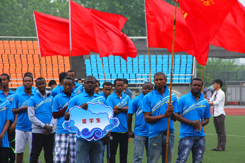5月17日 在27届校田径运动会上,留学生首次组队参赛
