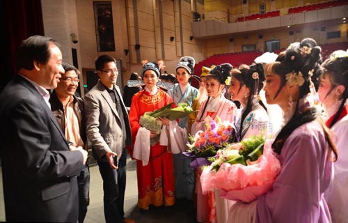 11月13日 王俊豪校长观看“红叶戏曲社”越剧专场演出后与表演的同学交谈