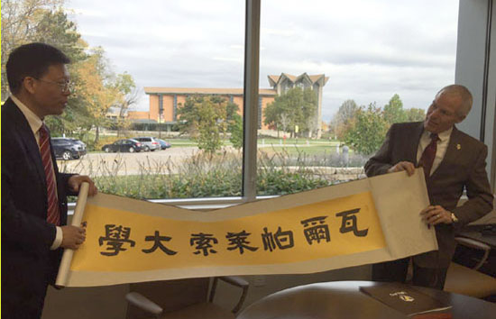 10月13日,代表团一行访问了瓦尔帕莱索大学(Valparaiso University),该校校长、校长助理、研究生院院长、商学院院长、Dr. Zhenhu Jin等领导和教授与我校代表团分别就“2+2”、“2+2+1本硕连读项目”、“MBA学生互访项目”等进行了友好、深入的商谈,并正式签订了合作协议。