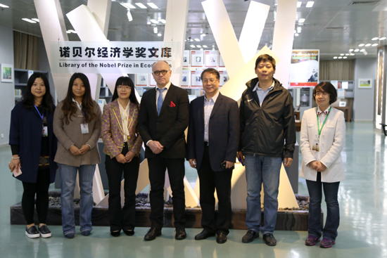 哈斯勒教授在副校长黄建新陪同下兴致勃勃地参观了财大校园和我校诺贝尔经济学奖文库。他对我校诺贝尔经济学奖文库给予了高度评价,认为该文库全面、系统地收集并展示了诺贝尔经济学奖获奖者的学术文献,以印刷型、数字化、视频资源等形式提供给读者,内容丰富、形式多样、信息量大,其系统性、连续性在全球范围内是独一无二的,很好地为广大经济学爱好者提供了丰富而系统的学习研究文献。