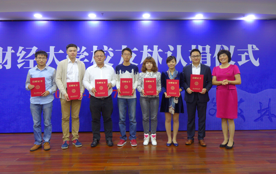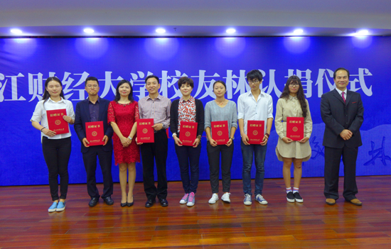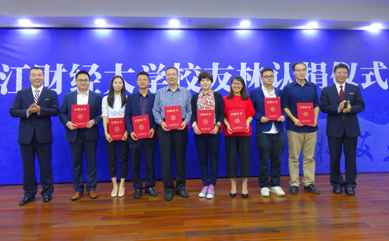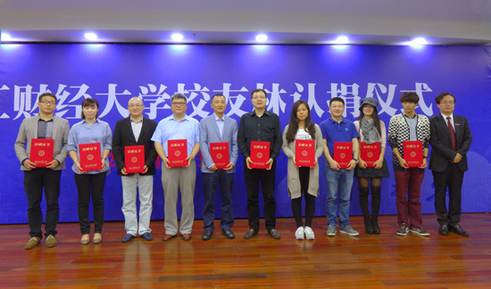 副校长黄建新宣读认捐名单。杭州校友会、会计学院校友会、萧山校友会等团体及校友代表上台接受授牌并与校领导合影。