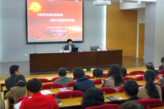 培训班先后邀请了省委组织部调研室主任徐仲仪作了“当前我省党建工作新形势”的专题报告,浙江大学马克思主义学院段治文作了“‘严以用权’,推进‘三严三实’教育的深入”的辅导报告,浙江大学统战部部长赵文波作了“学习贯彻中央和我省统战工作会议精神”的工作报告,“全国十大最美教师”苏德矿教授作了“我的教学六字经——懂、透、精、趣、情、德”的交流报告。