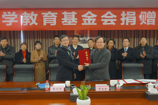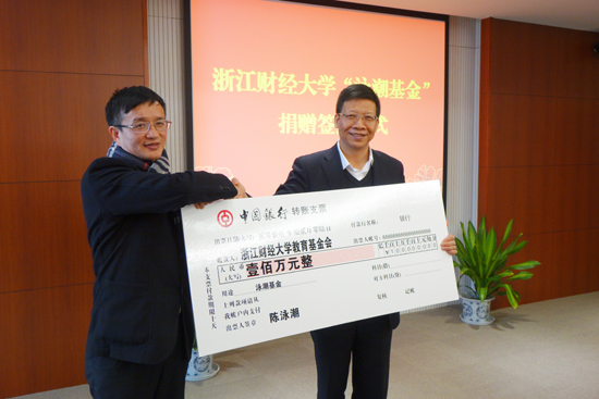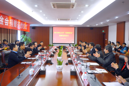12月6日上午,学校教育基金会捐赠签约仪式在行政楼412会议室举行。北京千舟清源基金管理公司董事长陈泳潮,浙江省医学科学院党委副书记、纪委书记柳利红,上海锦天城律师事务所高级合伙人章晓洪,浙江千合并购基金管理有限公司董事长徐海滨,校领导陈根芳、黄建新以及金融学院、中国金融研究院、党校办、学生处、教务处、研究生处、财务处、审计处负责人和学生代表等出席了捐赠仪式。