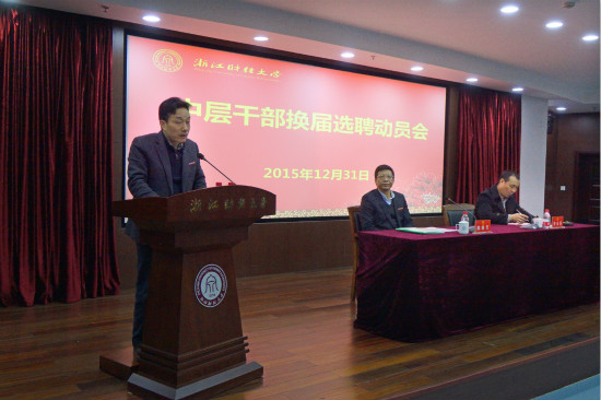 本届中层干部自2013年4月受聘以来,即将任期届满。党委书记陈根芳在讲话中对本届中层领导班子和中层干部为学校发展所做的积极贡献表示衷心感谢,他强调指出,本次换届选聘是学校加强干部队伍建设、推进干部人事制度改革的一项重要工作,更是深化落实我校第一次党代会确立的奋斗目标,建设高水平创新创业型财经大学的重要举措。