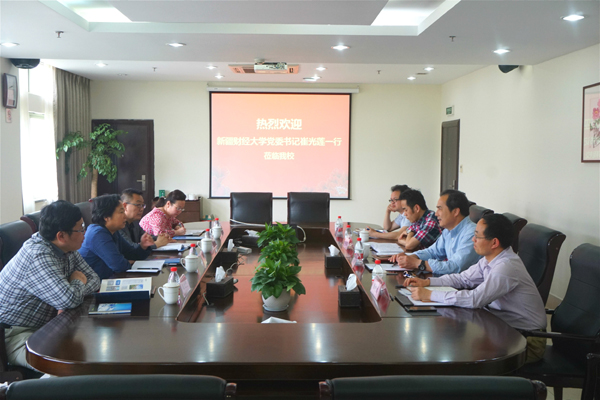 本网讯(通讯员 张成亮)5月18日下午,新疆财经大学党委书记崔光莲、副校长孙国辉一行4人来我校调研交流。校纪委书记陈金方、副校长王奎泉热情接待了来宾。
