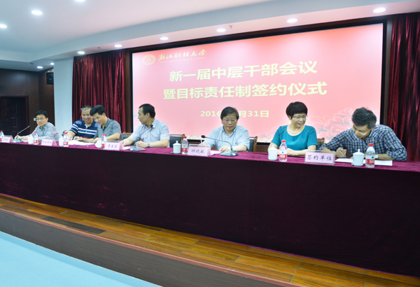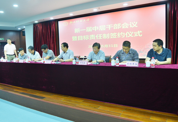 本网讯(通讯员 戴栗军 段雪辉)5月31日下午,学校在学术中心第四报告厅召开新一届中层干部会议暨目标责任制签约仪式。校党政领导班子成员、新一届全体中层干部参加会议。校党委副书记卢新波主持会议。
