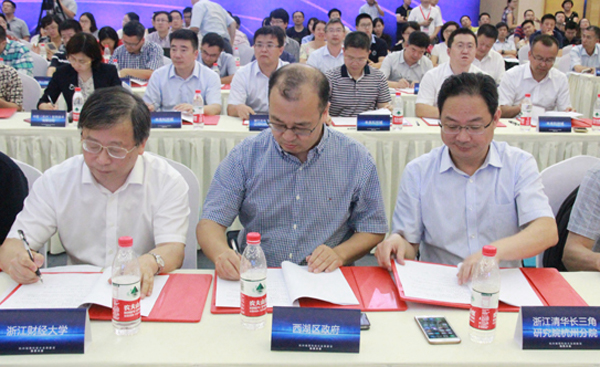会上发布了杭州城西科创大走廊规划、支持政策和综合交通建设规划方案,展示了一批重点建设项目。我校文华清创园项目作为重点项目进行了合作签约仪式,校长钟晓敏、杭州市西湖区副区长马品芳、清华长三角研究院杭州分院院长邵向荣签订了三方合作共建文华清创园项目的协议。