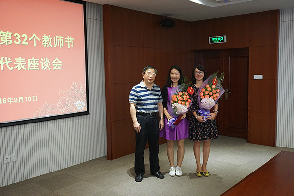 校党委委员、宣传部部长徐晓东向其他到会教师代表献花