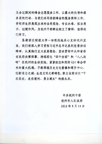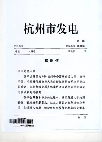 本网讯(通讯员 周宇 林坚)近日,杭州市委市政府、哈萨克斯坦驻上海总领事馆和杭州经济技术开发区公安分局致信我校,对我校圆满完成G20服务保障工作表示赞扬和感谢。