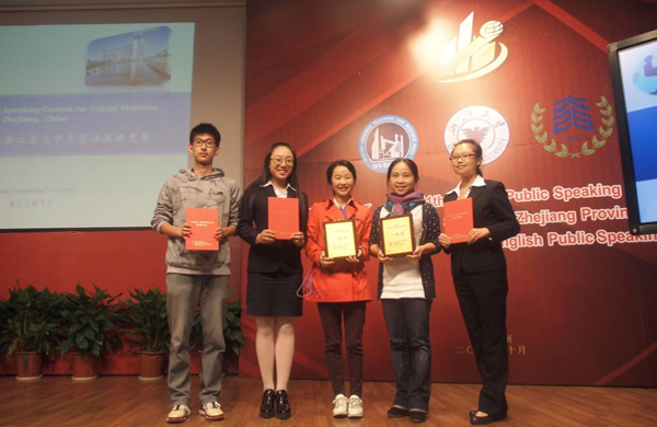本网讯(通讯员 张莲)10月29日至30日,第十一届浙江省大学生英语演讲竞赛暨“外研社杯”全国英语演讲大赛浙江省复赛在浙江工商大学举行。来自全省54所高校的155名选手参加了本次比赛。经过激烈角逐,由我校颜楚桐、鲁蕴睿、谢朱斌和潘雯婕四位同学组成的代表队,在外国语学院杨晨音老师和缪佳老师的带领下,获得了2项一等奖、1项二等奖、1项三等奖的好成绩。
