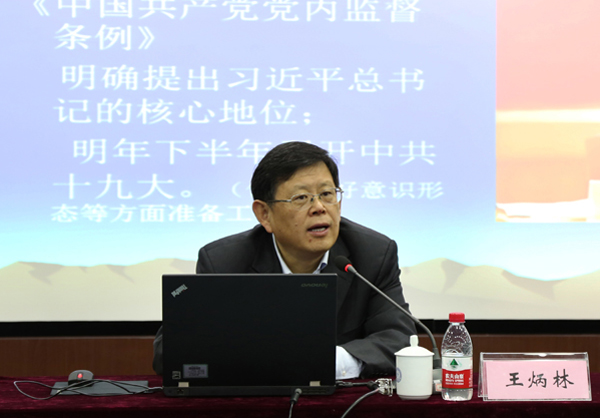 王炳林教授从党的十八届六中全会主要精神、高校意识形态工作面临的新形势、意识形态工作的主要任务、构建高校意识形态工作的大格局等四个方面入题,紧紧围绕习近平总书记重要讲话中的新思想、新论断和当前意识形态领域的各种新情况、新任务,详细阐释和深刻分析了意识形态的本质内涵及当前高校意识形态建设的重要性与复杂性。王教授以立位高远的理论阐述和丰富生动的案例佐证对我校深入学习贯彻党的十八届六中全会精神,深刻分析党的建设面临的形势和任务,坚持马克思主义在意识形态领域的指导地位,切实加强高校意识形态工作等方面提出了针对性的意见建议。
