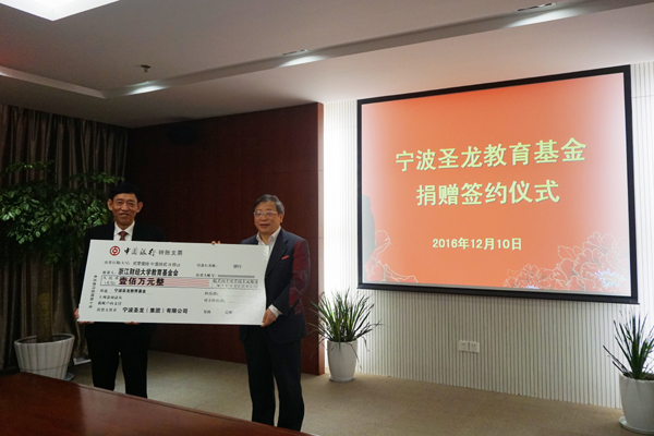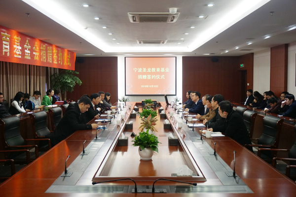 本网讯 12月10日上午,由宁波圣龙(集团)有限公司捐赠100万元设立的圣龙教育基金签约仪式在我校下沙校区举行。圣龙集团董事长兼总裁罗玉龙、副总裁罗力成、董事长秘书张勇,校长钟晓敏,中国金融研究院、党校办、计财处、校教育基金会办公室等相关部门负责人及师生代表等出席捐赠仪式。