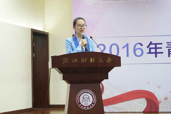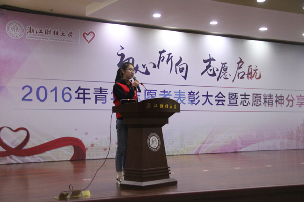 随后,优秀志愿者代表高雪莹、鲁金鑫、翁倩林先后分享了他们在G20杭州峰会、省大艺节、世界互联网大会等大型志愿活动中的艰辛、欢笑、喜悦与收获,号召在场的青年志愿者们继续秉承“奉献、友爱、互助、进步”的志愿者精神,彰显了财大青年学子的大局观念、担当意识和青春风采。