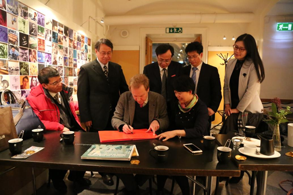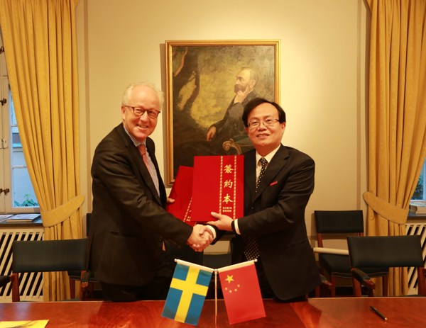 我校代表团一行还拜会了诺贝尔经济学奖评委会主席Per Stomberg教授、评委John Hassler教授及诺贝尔博物馆馆长Olov Amelin博士,参观考察了诺贝尔博物馆。双方就学校发展、文献馆建设、国际交流与合作等事项进行了广泛交流。受访者对文献馆建设成就给予了高度评价,诺贝尔经济学奖评委会主席Per Stomberg教授为文献馆题词祝福:诺贝尔经济学奖评奖委员会衷心感谢贵馆将诺贝尔经济学奖的影响扩大到中国乃至世界所作出的卓越贡献。在评委会的帮助下,文献馆获得了2016年诺贝尔经济学奖得主题签的代表作。