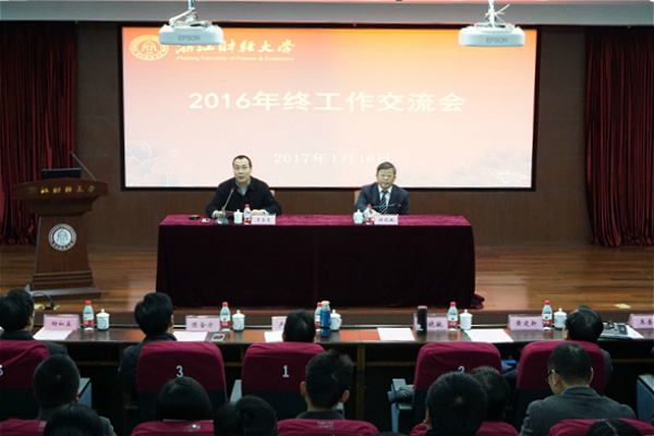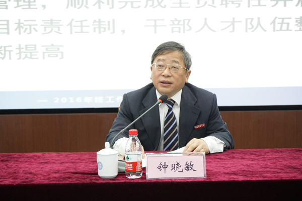 校长钟晓敏代表学校党政领导班子作2016年工作总结。他从学校顶层设计、干部人才队伍建设、教育教学水平提升、学科专业建设、科研和社会服务、招生就业、对外合作、校园文化建设、党建与思想政治教育、校园综合保障等十个方面对学校一年来的工作作了全面回顾和总结。他指出,学校在现代大学体制机制建设、高层次人才集聚、人才培养质量、高层次学科平台搭建等方面存在短板和不足,迫切需要通过综合改革加以解决。他希望全体中层干部和广大师生员工同心同德,把学校的发展和个人的发展结合起来,心往一处想、劲往一处使,撸起袖子加油干,在2017年的工作中充分发挥自己的聪明才智,攻克几个难关,啃下几根硬骨头,力争打破制约学校发展的瓶颈,实现学校的科学健康发展。