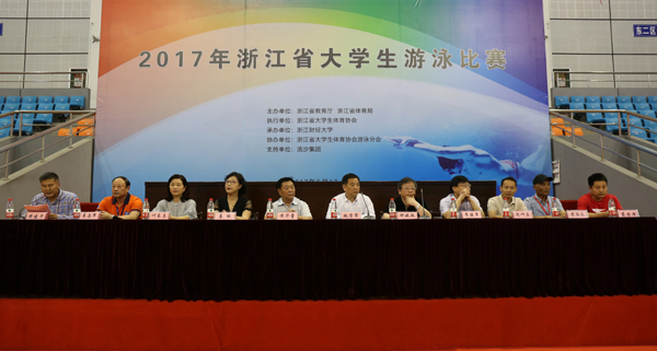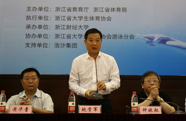 鲍学军宣布2017年浙江省大学生游泳比赛开幕。