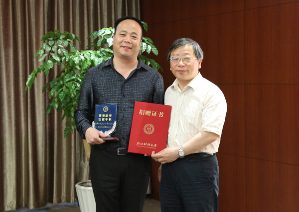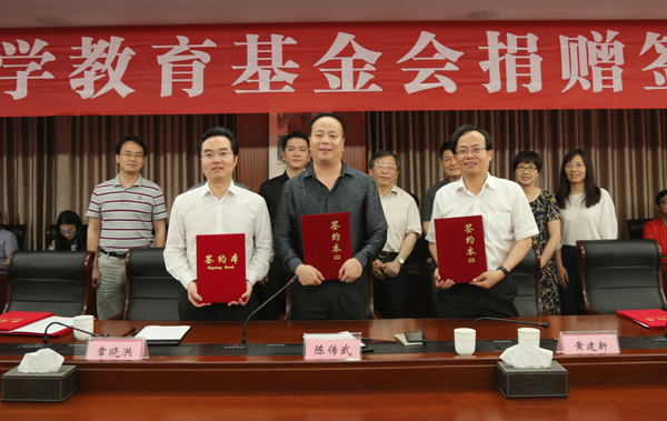 签约仪式上,双方签署了捐赠协议,钟晓敏代表学校接受了捐赠支票,并为陈传武颁发了捐赠证书和纪念杯;黄建新为陈传武颁发了我校兼职教授聘书。