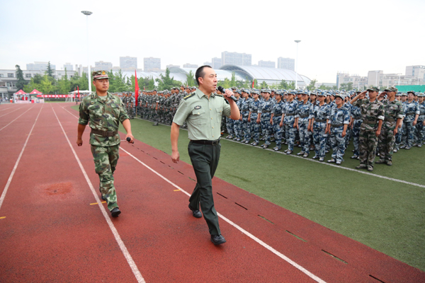 在庄严的国歌声中,阅兵式正式开始。校党委书记李金昌对各个方阵进行了检阅,并向参训学生致以亲切的问候。分列式表演中,各方阵迈着整齐的步伐精神抖擞地从主席台前走过,口号铿锵,动作标准,展现出了饱满的热情与昂扬的斗志,赢得了阵阵掌声。精妙绝伦的科目汇报表演中,女生方阵的“大风车”队列新颖独特,英姿飒爽;男生方阵的拳术表演强劲有力,整齐划一;教官们的擒拿展示威武勇猛,展现了军人的专业素质。