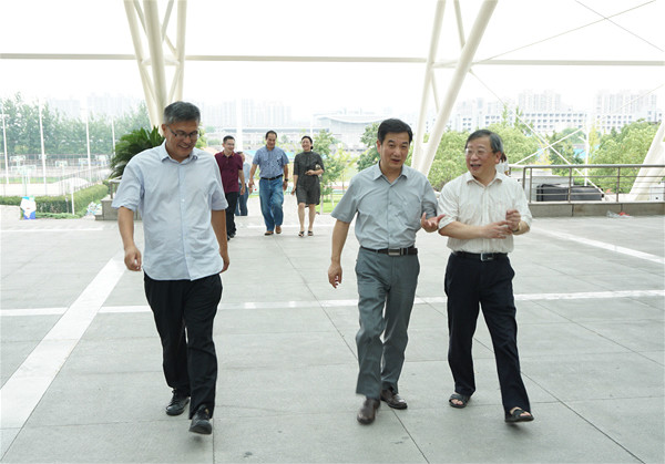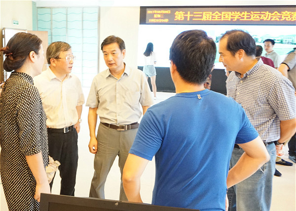 鲍学军一行实地视察了第十三届全国学生运动会竞赛指挥中心,游泳比赛场馆和功能用房,教练员及运动员公寓、食堂等地,详细了解了改扩建工程、信息保障、后勤服务、宣传、安保等工作进展情况。