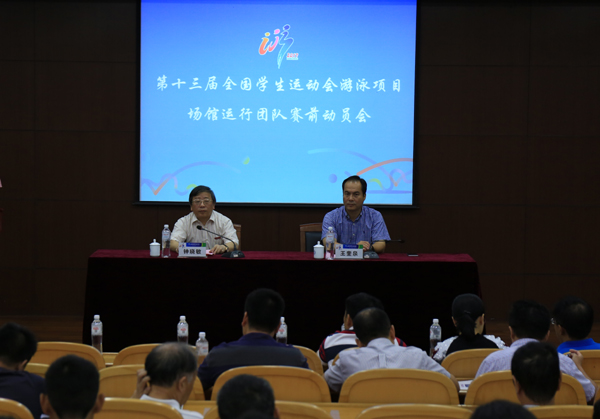 本网讯 当好东道主,办好游泳赛。9月2日上午,第十三届全国学生运动会游泳项目场馆运行团队赛前动员会在我校下沙校区学术中心召开。游泳竞赛委员会主任、校长钟晓敏出席会议并作动员讲话,游泳竞赛委员会执行副主任、副校长王奎泉主持会议,全体场馆运行团队工作人员参加会议。