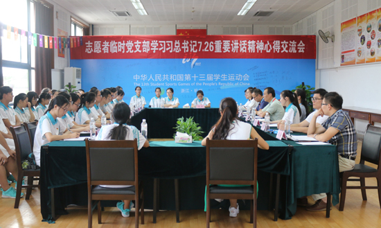 本网讯(通讯员 杨忍)9月9日下午,第十三届全国学生运动会买球体育官方网站志愿者临时党支部系列活动之学习习近平总书记“7.26”重要讲话精神心得交流会在志愿者之家举行。校党委书记李金昌出席并讲话,党校办、校团委负责人,临时党支部全体老师以及35名志愿者党员、预备党员和部分入党积极分子代表参加交流会,会议由临时党支部副书记、2014级会计学院石妙悦同学主持。