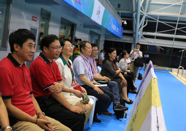 陈红英视察了游泳场馆、体育文化展馆、运动员休息室等场所,详细了解了游泳场馆运行团队的组织构架、运行流程及赛事安排,对大学组游泳比赛首日运行情况给予了充分肯定,对学校赛事组织、安全保卫、志愿服务等工作给予了高度评价。