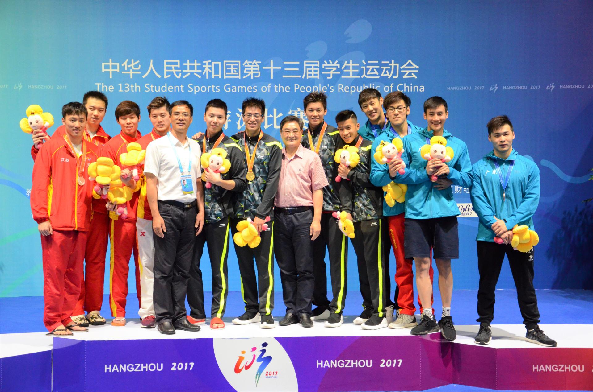 李云林为游泳项目大学男子乙组4*100米混合泳接力获奖者颁奖。