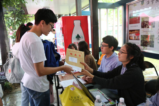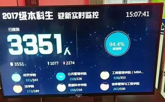 今年学校启用了全新的学工系统,通过前期的网上预报到和基本信息录入,进一步增加了迎新工作的有效性、针对性和便捷性。报到手续只需短短几秒就能完成,学生事务中心门口的显示屏,实时显示最新的报到人数、未到人数以及各个省份的生源情况,“数字创新”让所有进程一目了然。学校还专门为家庭经济困难的同学设立了绿色通道,向前来办理的同学宣传勤工助学和各类资助项目,对通过审核且有意向勤工助学的同学确保上岗机会,还为贫困生赠送了包含学习用品的爱心礼包。