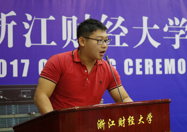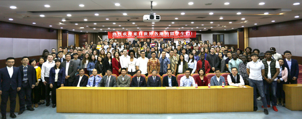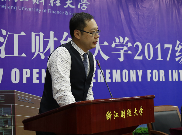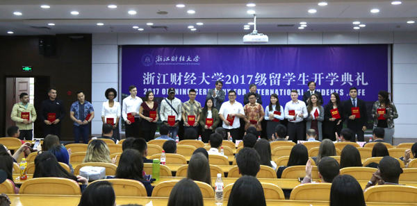 本网讯 10月24日下午,2017级留学生开学典礼在我校下沙校区隆重举行。来自全世界45个国家的200名留学新生齐聚一堂,共同开启在我校留学生活的新篇章。校长钟晓敏、副校长黄建新以及国际学院、国际交流合作处、学生处、教务处、研究生院、工商管理学院、经济学院等相关部门负责人、教师代表出席开学典礼。开学典礼由国际学院院长余慕鸿主持。