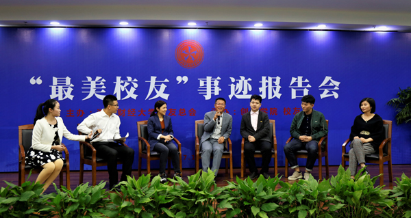 随后,五位最美校友与在座师生分享了自己的成长经历。赵银锋向大家讲述了他的创业历程,他认为成大事者,必须心怀梦想,不畏艰难,脚踏实地,坚持不懈。傅夷通过介绍自己从一名报社记者到创业人的职业生涯角色的转换,鼓励各位同学在明确目标的前提下要勇于创新。朱红贞向大家分享了自己从留学加拿大到创建省内首家工业设计公司的历程,她建议大学生在创业的过程中要注重过往积累,充分利用校友资源。吴枝颖分享了自己参与社会公益事业的初衷,因为亲眼见过,所以感触颇深,并鼓励学弟学妹们尽早明确目标,勇于追梦。陈百强分享了一个爱好音乐的文艺青年“误入”警察行业,并由此深深爱上这份职业的心路历程。