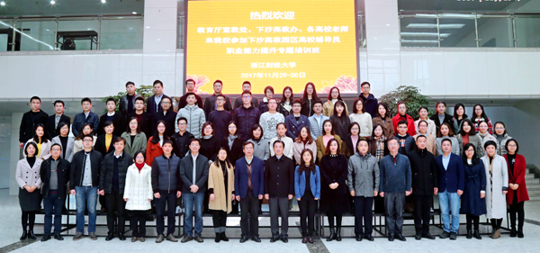 本网讯(通讯员 胡哲)11月29日,下沙高教园区高校辅导员职业能力提升专题培训班在我校开班。校纪委书记陈金方、省教育厅宣教处副调研员丁晓、下沙高教园管委会办公室主任胡惠华及高教园区各高校学工部负责人、全体培训学员等参加了开班仪式。仪式由校学工部部长范建锋主持。