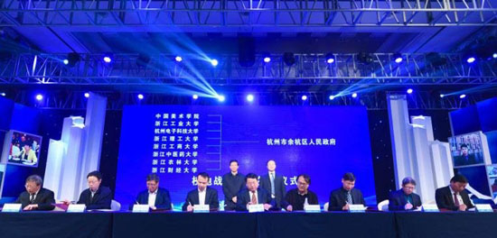 校长钟晓敏和余杭区区长陈如根分别代表双方签订战略合作协议。