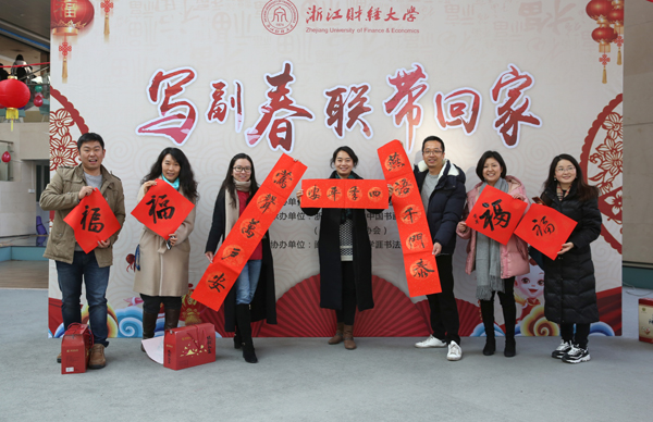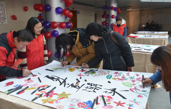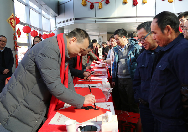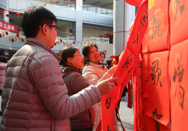 “写副春联带回家”活动现场吸引了众多老师参与。他们有的请书法专家书写自己喜爱的春联,有的自己挥毫泼墨,大家兴致昂扬、其乐融融。大红的福字、喜庆的灯笼,活动现场洋溢着浓浓的年味儿。