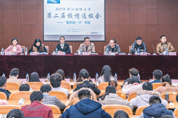 本网讯(通讯员 夏怡倩)12月29日,学校“最多跑一次”专题校情通报会在下沙校区召开。校党委委员、宣传部部长徐晓东,校团委、党校办、学生处、教务处、信息办、后勤服务中心等相关职能负责人和各学院学生会主席、班干部、党员、普通学生代表近200人参加会议。会议由校学生会主席杨涵主持。