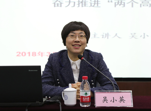 开班仪式后,杭州电子科技大学党委委员、宣传部部长、新闻中心主任吴小英教授以“高举习近平新时代中国特色社会主义思想伟大旗帜,奋力推进‘两个高水平’建设”为主题作了首场专题辅导。她立足浙江发展实际,以浙江作为习近平新时代中国特色社会主义思想的重要萌发地为切入点,结合我省过去五年的经验总结、今后五年的工作奋斗目标以及工作任务,对十九大精神进行了系统、精准而生动的解读。
