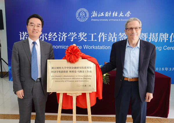 埃里克·马斯金教授,校长钟晓敏、副校长黄建新及相关部门、单位负责人和师生代表等出席签约暨揭牌仪式。