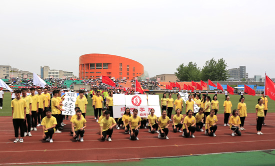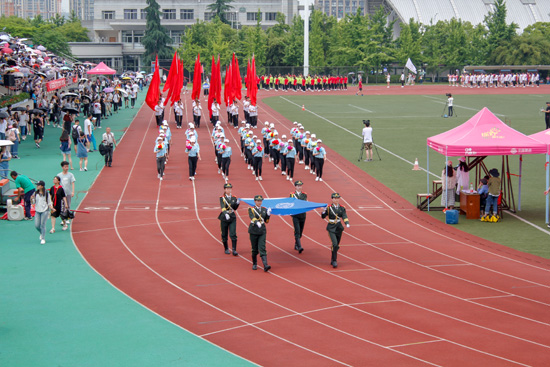 伴随着雄壮的运动员进行曲,国旗队、校旗队、鲜花队、红旗队、教职工代表队以及各学院代表队精神抖擞,意气风发,迈着整齐的步伐,依次走过主席台。