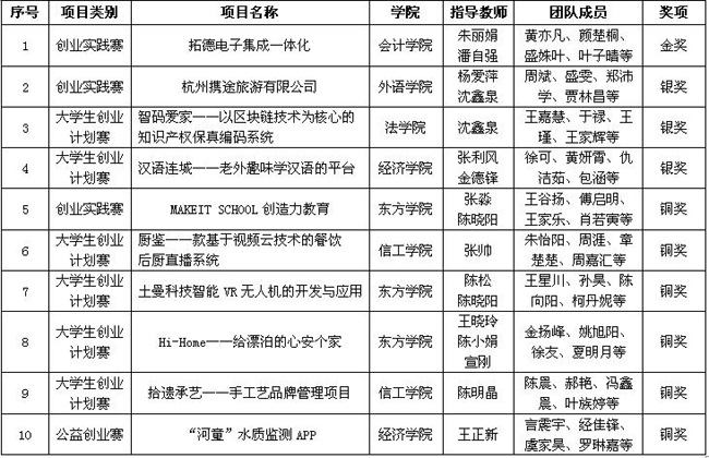本网讯 5月20日,“创青春”浙江省第十一届“挑战杯”大学生创业大赛决赛在浙江工商大学落下帷幕。本次大赛共有来自全省77所高校的934件作品参加省级复赛,最终45所高校的216件作品入围省级决赛。经过激烈角逐,我校共获得金奖1项、银奖3项、铜奖6项的优异成绩。