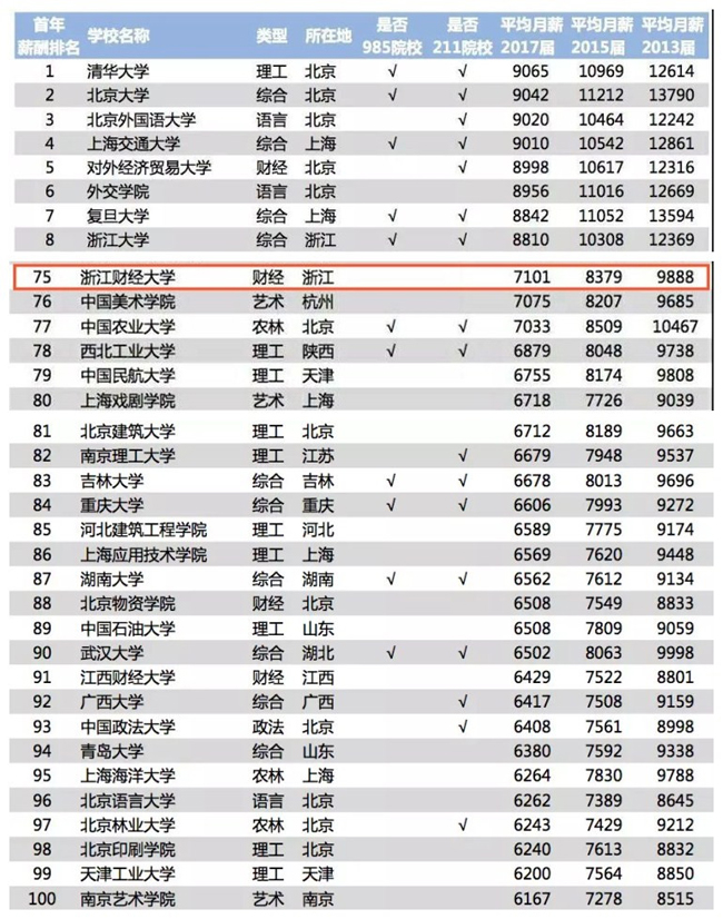 此榜单通过对包括39 所 985 工程院校和112 所 211 工程院校在内的数百所高校2017 届、2015 届、2013 届本科毕业生进行调研(调研样本数量达到281万人),计算出各高校毕业生薪酬状况。