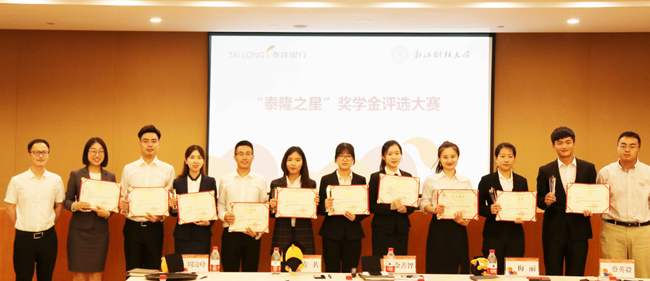 本网讯(通讯员 袁茗)5月29日,我校第九届“泰隆之星”奖学金评选大赛在浙江泰隆商业银行举行。经层层选拔,共有22位同学进入企业决赛现场,最终颜楚桐、王书杰、夏静、何红亮、王嘉慧、徐丽帅、孙桢、张宁、刘小菊、陈谦等10位同学荣获“泰隆之星”奖学金。