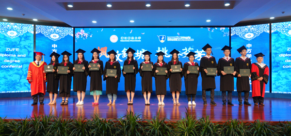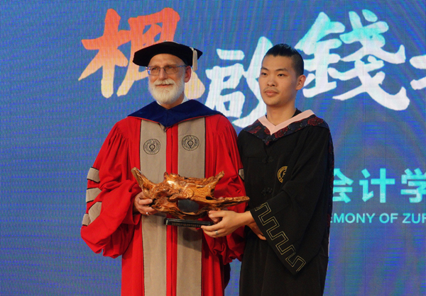 钟晓敏和会计学院院长李连华为毕业生授予中方学位证书,并为毕业生拨穂。Pierre Zundel和Stephen Havlovic为毕业生颁发了劳伦森大学工商管理学士学位证书。