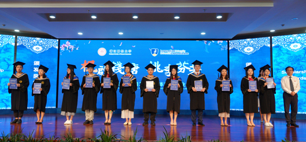 黄建新为26名获得双学位的毕业生颁发了奖学金,Stephen Havlovic 和李连华为国际会计人才培养基地进行了揭牌。