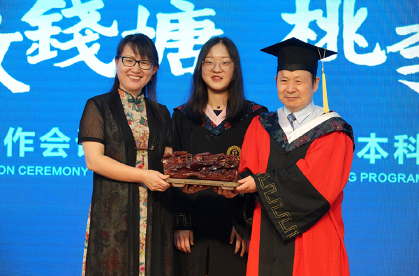 毕业生向中加两所母校赠送了精心准备的“步步高升”和“一帆风顺”木雕礼物。