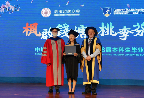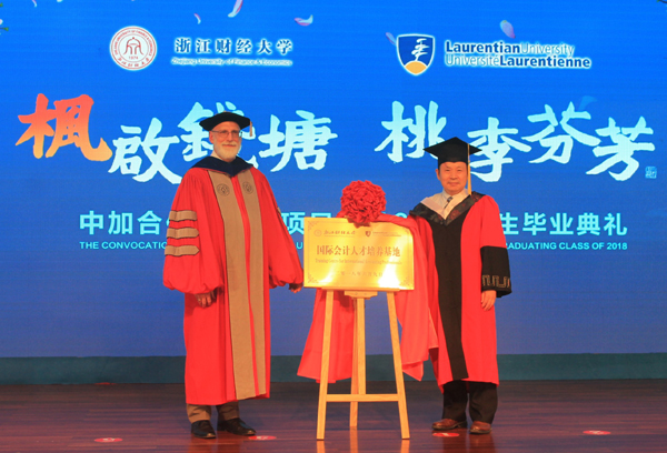 本网讯 6月9日,学校中加合作会计学项目2018届本科生毕业典礼在下沙校区举行。校长钟晓敏,副校长黄建新,劳伦森大学代理校长兼副校监Pierre Zundel,河海大学副校长、前驻加拿大多伦多总领馆教育组参赞衔领事徐卫亚,加拿大特许专业会计师协会副总裁傅岚熙,劳伦森大学商学院院长Stephen Havlovic,CPA Canada中国区执行理事Barbara Ko,我校学生处、国际处、教务处、党校办负责人及会计学院师生和毕业生家长代表等近400人出席毕业典礼。