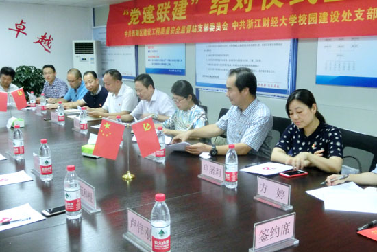 西湖区建设工程质量安全监督站支部委员会、中宙建工集团有限公司工程项目支部委员会与我校校园建设处党支部共同签署了《杭州市建设行业系统“百个支部结对百个工地”协议书》,并为本工程“双百结对联建工地网络党支部”揭牌。