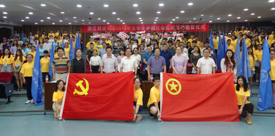 本网讯 7月6日,学校2018年暑期社会实践活动出征仪式在下沙校区举行。副校长黄建新,校党委委员、宣传部部长徐晓东,省农业和农村工作办公室、社会发展处处长邵晨曲,各相关职能部门和学院分管学生工作负责人、暑期社会实践指导教师和学生代表等近300人参加出征仪式。