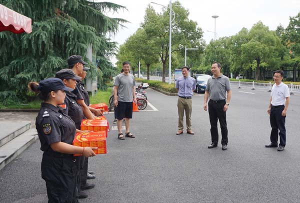 本网讯 7月23日,正值“大暑”节气之际,校党委书记李金昌、校长钟晓敏、校党委副书记卢新波、副校长王奎泉先后走访了图书馆、体育部、保卫岗亭、监控中心、学术餐厅等地,视察了文华校区一期改扩建工程、学生寝室改造工程和现教中心顶楼修漏工程工地,看望慰问了暑期坚守工作岗位的教职员工、施工人员、游泳馆志愿者和留校学生,给大家送去了学校的关心与问候。